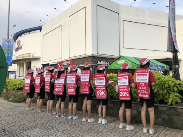 Xen kẽ trong quá trình di chuyển có thể tổ chức thêm các hoạt động như phát tờ rơi, tặng quà dùng thử, tổ chức chụp ảnh, trò chơi tương tác… nhằm thu hút sự chú ý của người đi đường. Hình thức này có chi phí rẻ nhất bởi không tốn khoản thuê và lắp đặt xe, giá thành sản xuất biển quảng cáo và thuê PG cũng không hề đắt đỏ, dễ dàng triển khai và xin phép hơn nhiều.